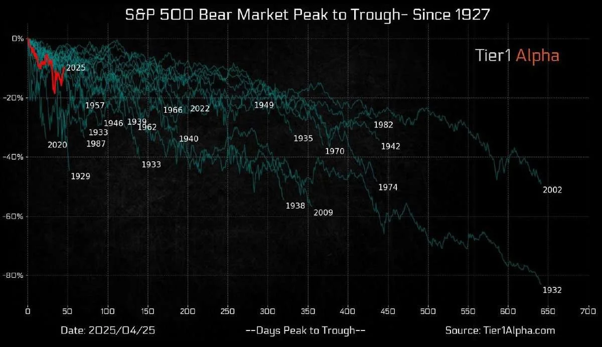 As illustrated by the charts above, bear markets in 2000, 2008, and most recently 2022, each experienced multiple rallies of +10% or even +15% before ultimately returning to new lows. It's important to note that these corrections typically unfold over a longer period, often taking more time than the 33 trading days it took to reach the bottom in 2025. To further illustrate this point, we have included a chart from Tier 1 Alpha that details all previous bear markets since 1927, highlighting the duration and magnitude of corrections from peak to trough.