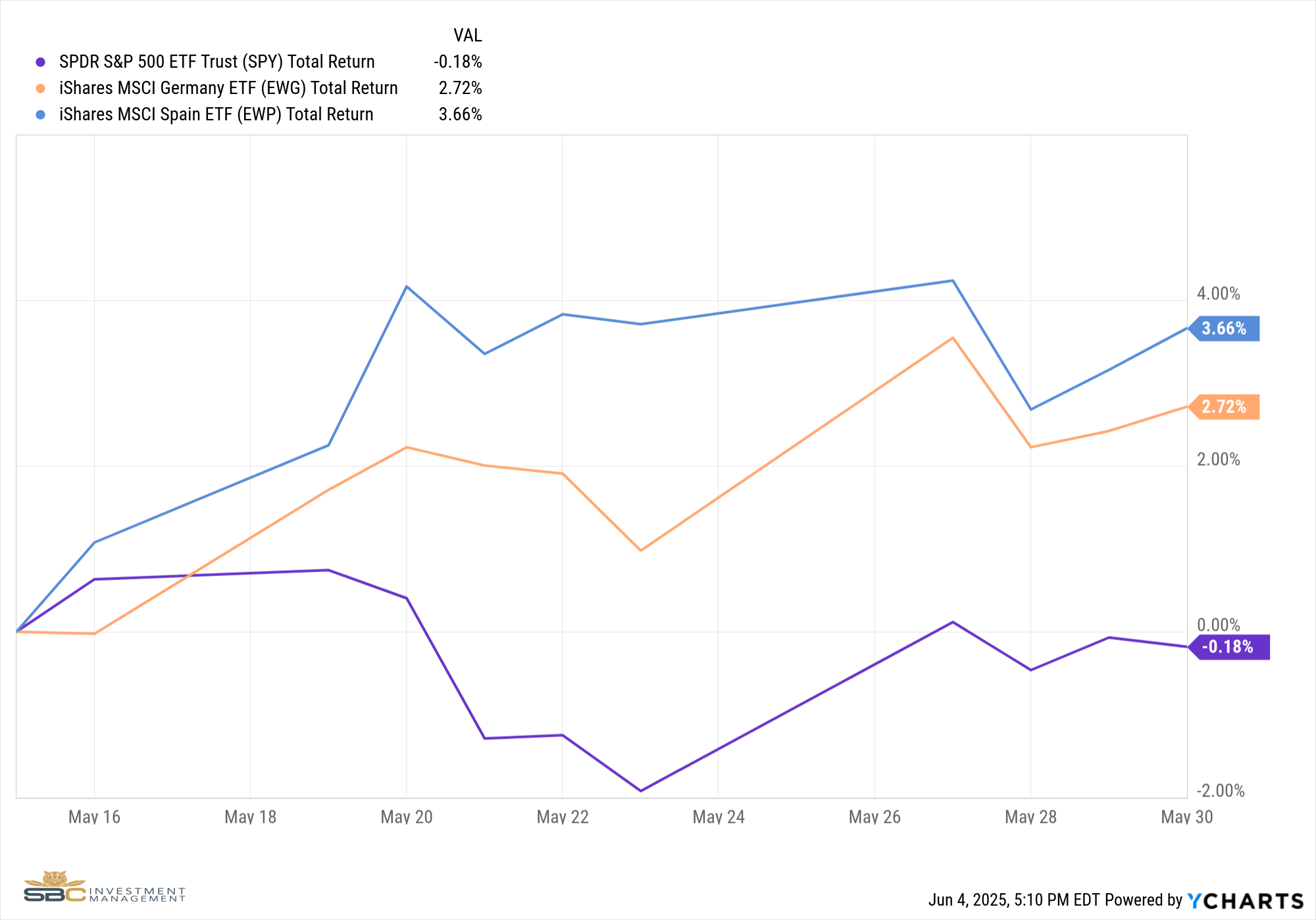 From a global growth perspective, we continue to favor European equities—particularly Germany (EWG) and Spain (EWP)—as our models currently show fewer macroeconomic headwinds than we are observing in the U.S. This positioning was validated in the second half of May, when SPY returned just -0.18% while EWG and EWP posted gains of 2.72% and 3.66%, respectively. We see room for continued outperformance in these markets if European monetary easing gains traction.