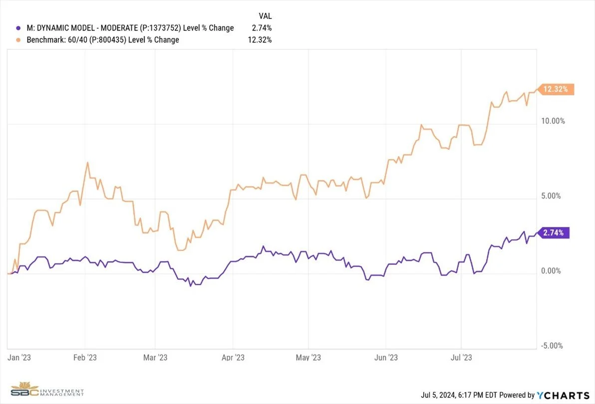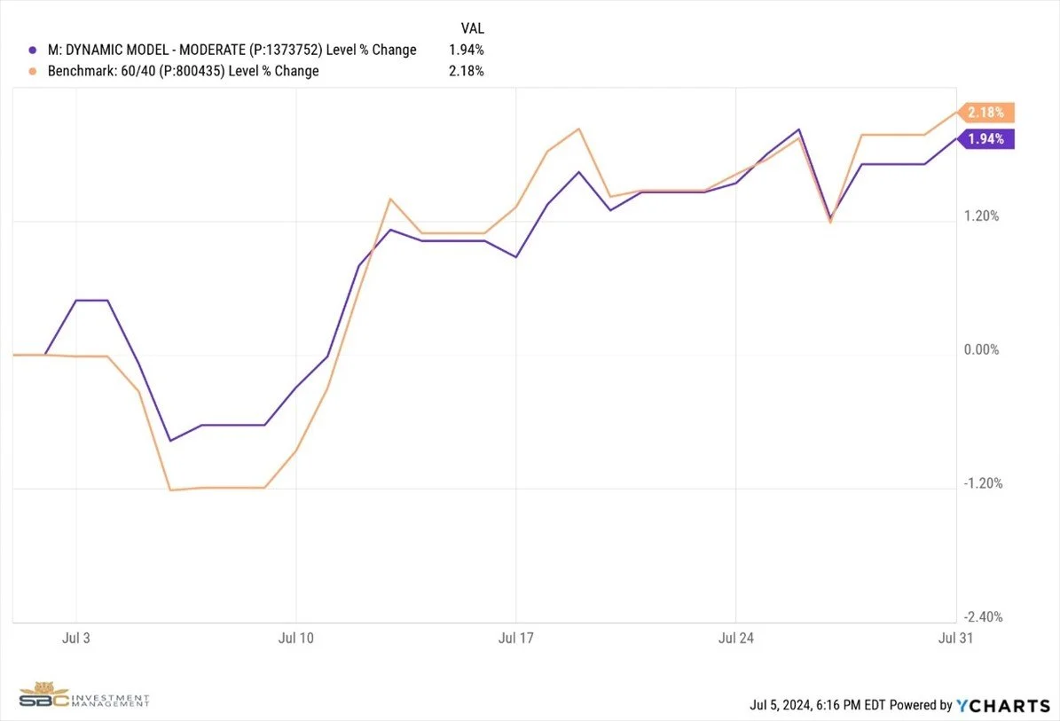 Our Moderate model portfolio returned 1.94% during the Month of July and finished the month with 2.74% Year To Date (see charts below).