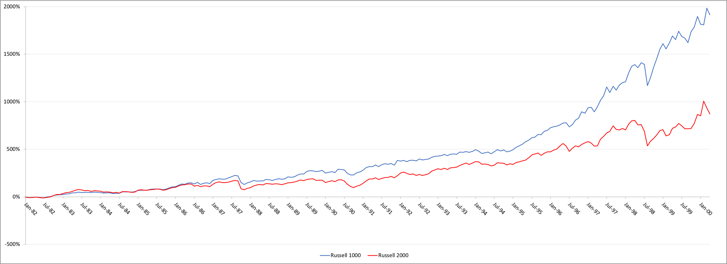 Russell 1000 and 2000 Indexes – Cumulative Total Returns, 12/31/1981 through 4/30/2000
