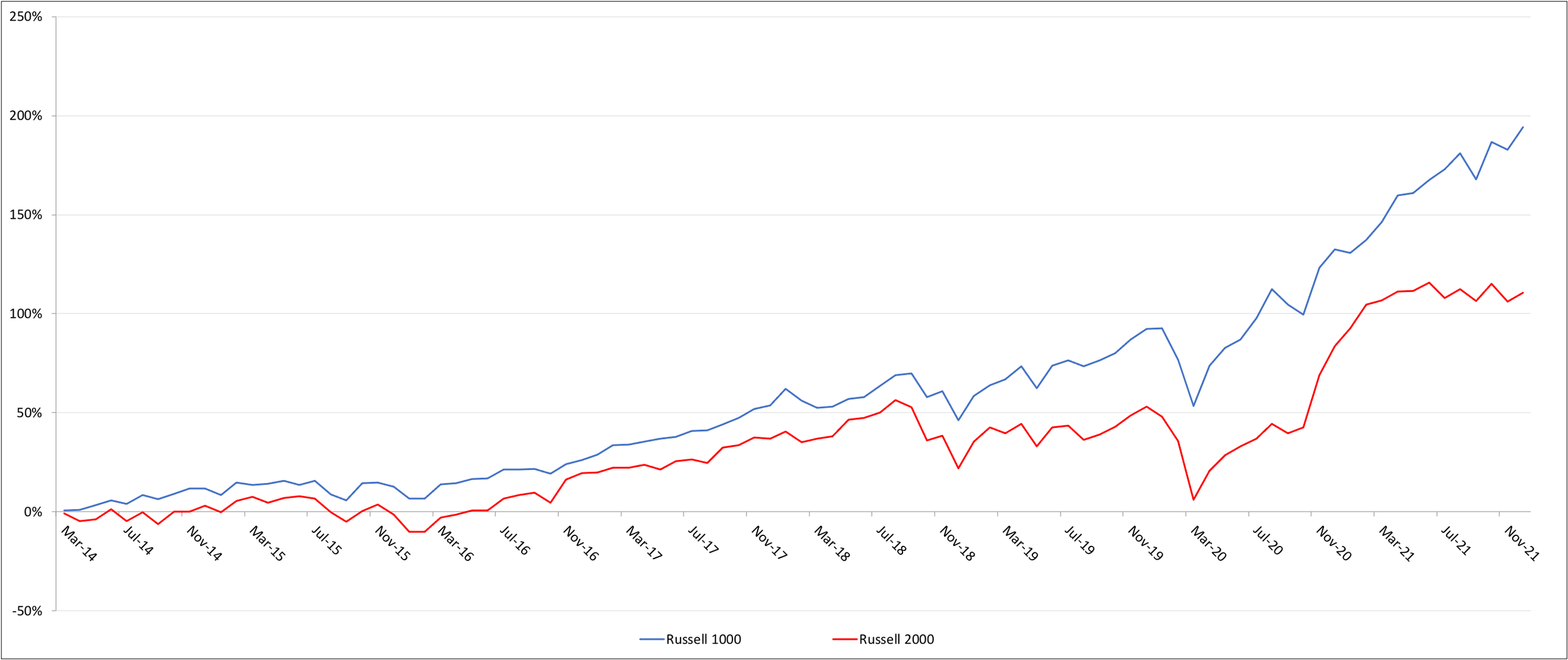 Russell 1000 and 2000 – Cumulative Total Returns, 2/28/2014 through 12/31/2021