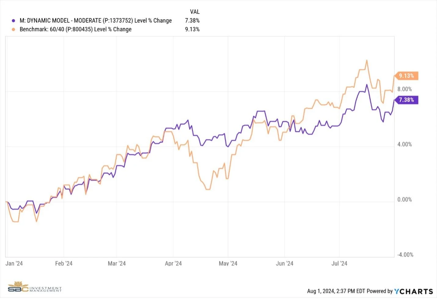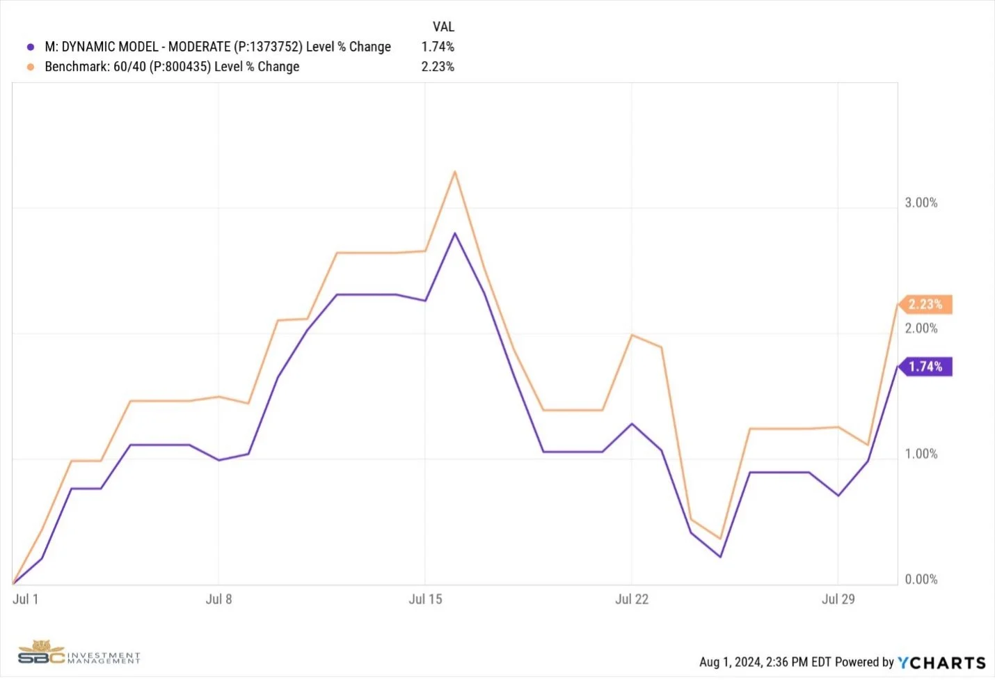 Our Moderate model portfolio returned 1.74% during the Month of July and finished the month up 7.38% Year to Date (see chart below).