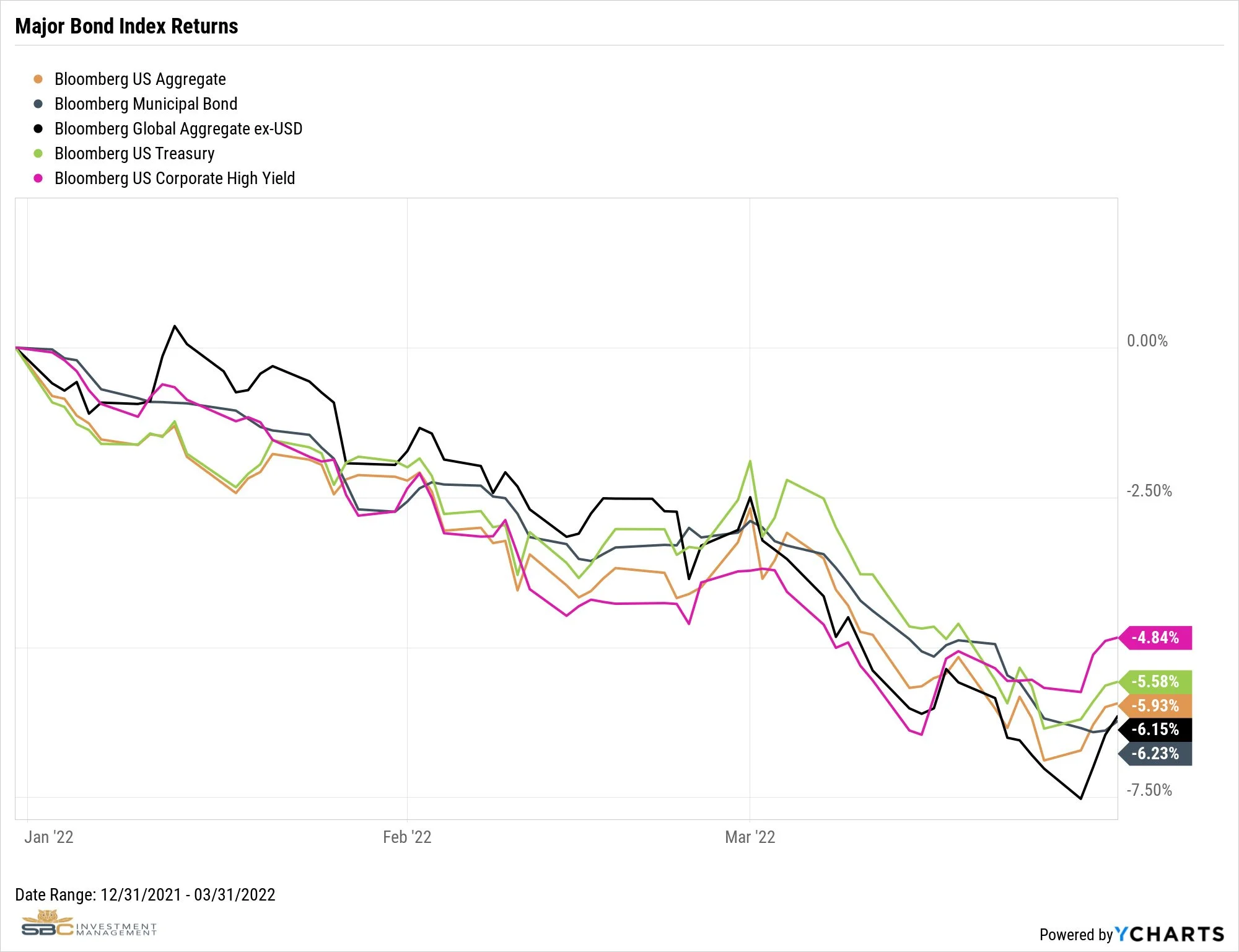 For the first quarter of 2022, the Bloomberg U.S. Aggregate Bond Index dropped 5.93%. The Treasury index declined by 5.58%, the Municipal Bond index dropped by 6.23%, and the Corporate High Yield index declined by 4.84%.