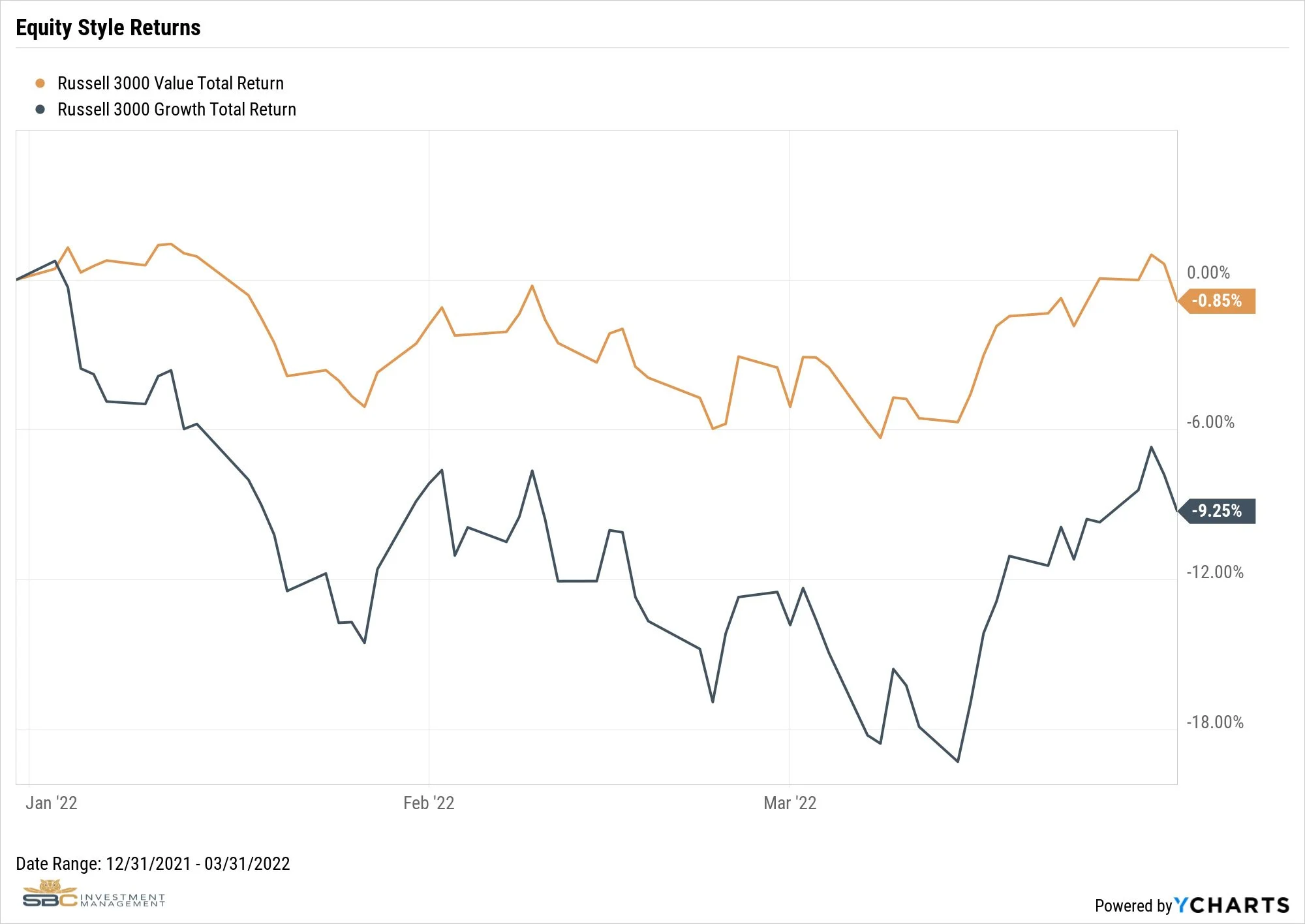 Value vs. Growth. Value stocks posted returns that exceeded their growth counterparts by an impressive 8.6%. The Russell 3000 Value Index returned -0.85% versus -9.25% for the Russell 3000 Growth Index.