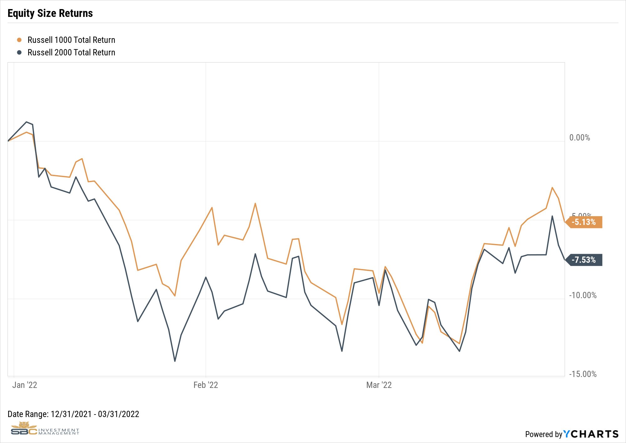 Large Cap vs Small Cap. While large cap stocks ended the quarter ahead of small cap stocks, the two tracked each other relatively closely. The Russell 1000 Index returned -5.13% and the Russell 2000 Index returned -7.53%.