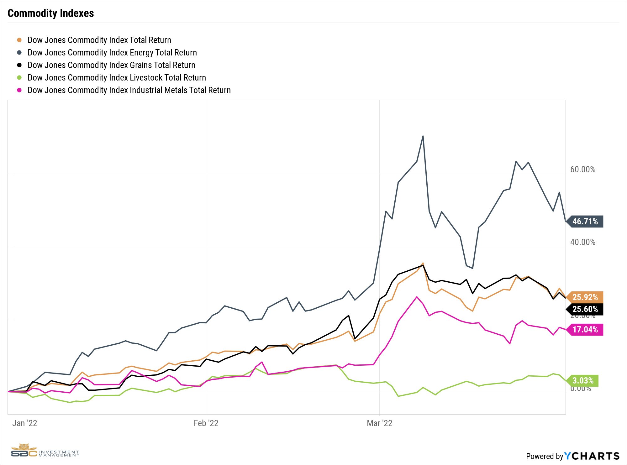 For the first quarter of 2022, the Dow Jones Commodity Index returned 25.92%. Within the index, Energy returned 46.71%, Grains returned 25.60%, Industrials metals returned 17.04%, and Livestock returned 3.03%.