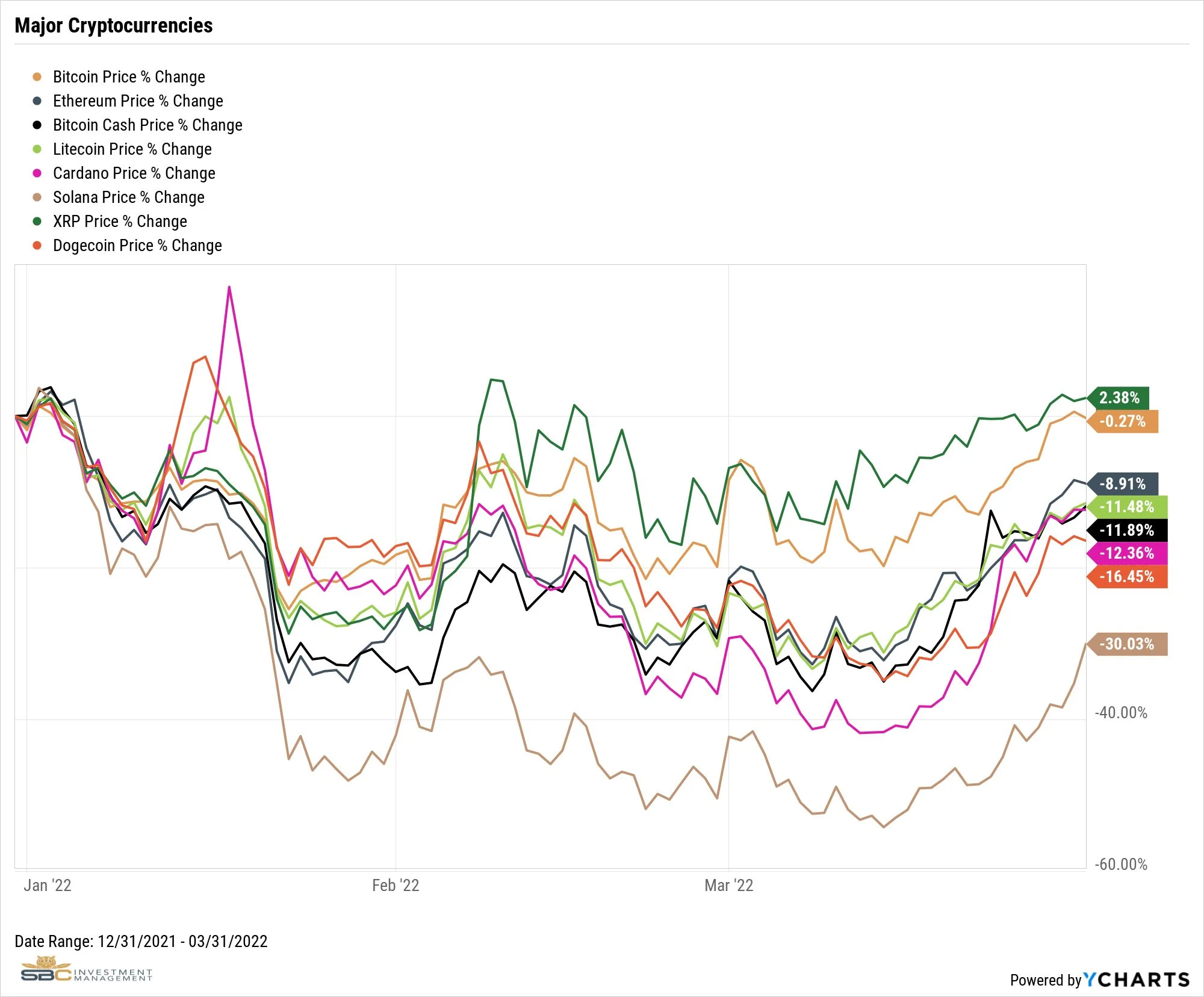 Dispersion amongst the major cryptocurrencies was high during the quarter. XRP was the best performer returning 2.38%, while Solana was the worst at -30.03%. Bitcoin came in flat, while the rest were well entrenched in negative territory.