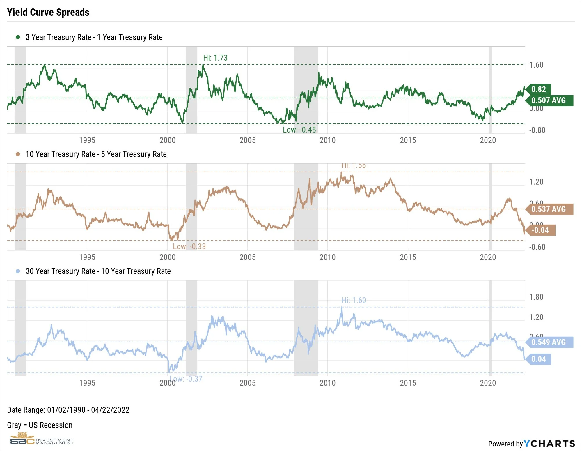 Bonds steadily declined during the quarter as the Fed ceased its bond-buying program and implemented its first rate hike in March. Expectations for a 2.50% yearend Fed funds rate caused the short end of the Treasury yield curve to start rising in earnest. With a tight labor market and the cost of capital increasing, small businesses confidence continued to wane. Mortgage rates jumped to 5.0%, raising the likelihood of a housing decline. Both the manufacturing and services sectors continued dropping, and consumer confidence reached an 11-year low. Investors began preparing for an economic slowdown by piling into longer-term Treasuries causing the yield curve to flirt with inversion.