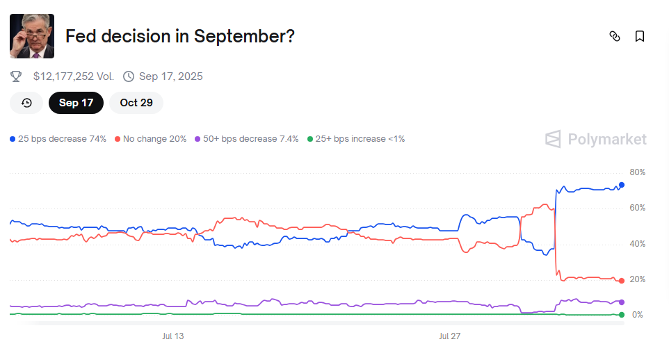 July brought the exact economic mix the Federal Reserve has been looking for: a second consecutive m/m 0.2% rise in core CPI and only 73,000 new payroll jobs, the lightest monthly gain since 2010. Together, the data pushed futures to price an 74% probability of a first rate cut at the September 17th FOMC meeting. Markets responded in textbook fashion—yields fell, duration rallied, and cyclically sensitive equities caught a bid, while our own portfolios underwent one of the heaviest months of repositioning this cycle.