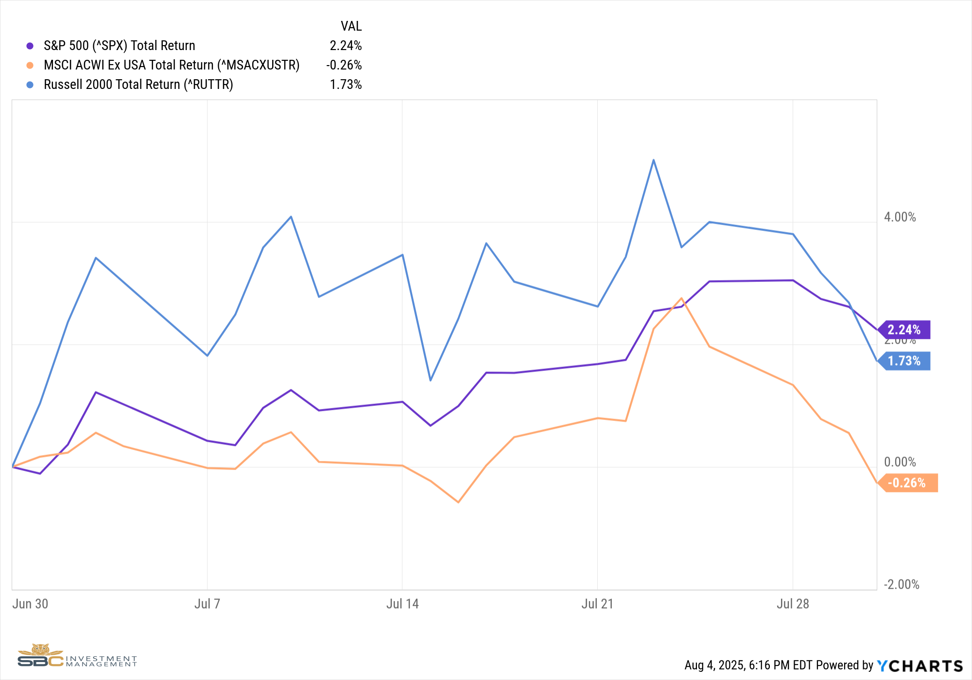 The S&P 500 advanced 2.24% for the month, pushing the year-to-date gain north of 8% despite late July profit-taking. Microsoft and Meta delivered double-digit earnings surprises on AI demand, lifting the Nasdaq-100 to yet another all-time high. More importantly, market breadth improved: The Russell 2000 added 1.73% as regional banks, and industrial cyclicals joined the party.