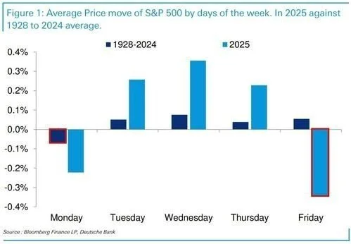 Due to these factors, we believe volatility may be here to stay in 2025 or at least over the next 4-8 months. Below is a chart from Bloomberg Finance showing the average price move of S&P 500 by day of the week, comparing 2025 to the historical average going back to 1928.