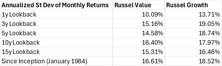 As you can clearly see 2025 has been volatile and those who have not had diversification within their portfolio have felt that volatility more so than others. As we move forward, we continue to favor value stocks over growth stocks in the equity market as value stocks tend to out preform growth over long periods of time and often times have lower volatility . As a reminder, value stocks typically have lower P/E ratios and higher dividend yields, have historically offered a more stable investment during uncertain times. The chart below compares the Annualized Standard Deviation of Monthly Returns of the Russel Value and Russel Growth Indexes. As a reminder, higher standard deviation indicates more volatility, while lower standard deviation signifies steadier returns.