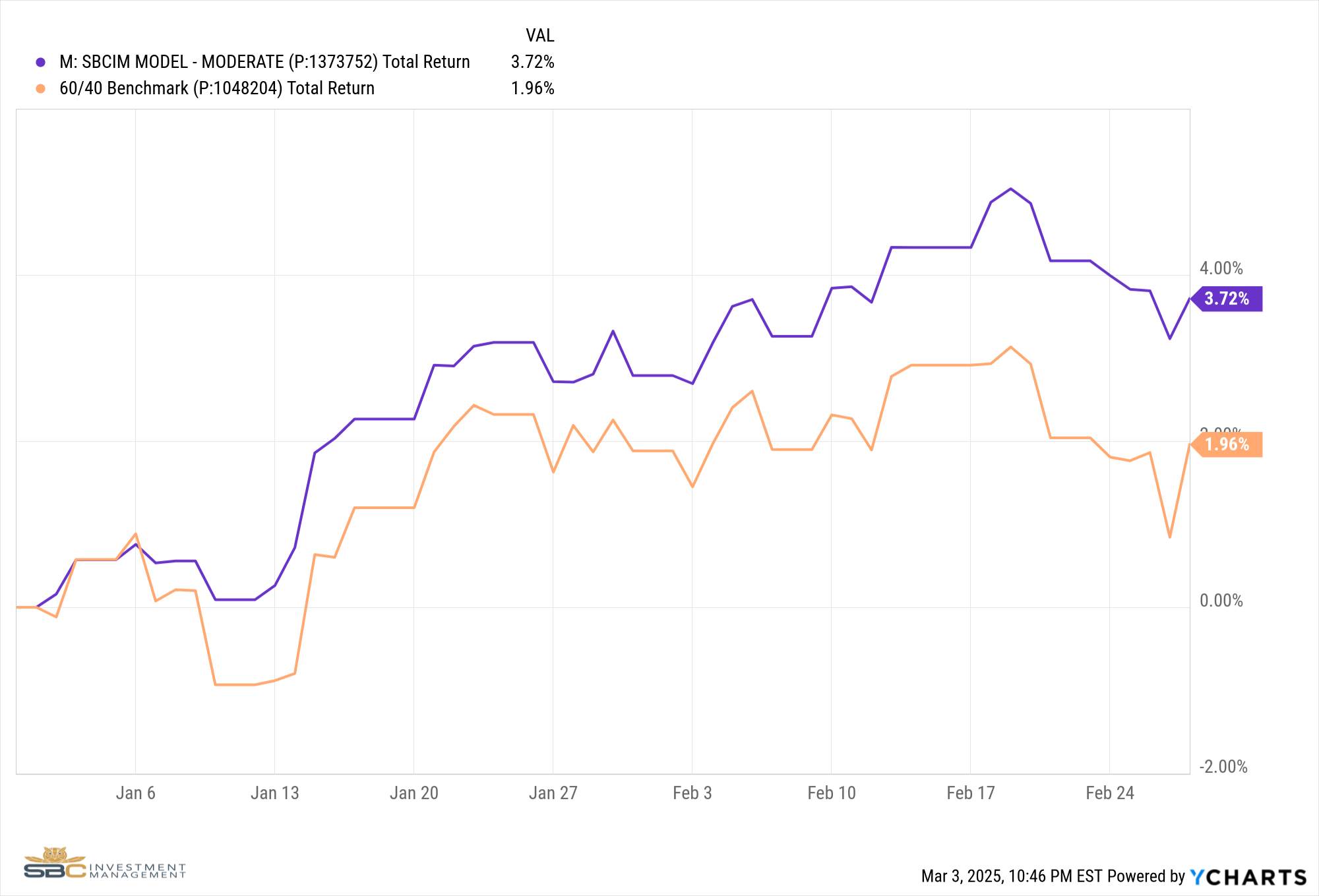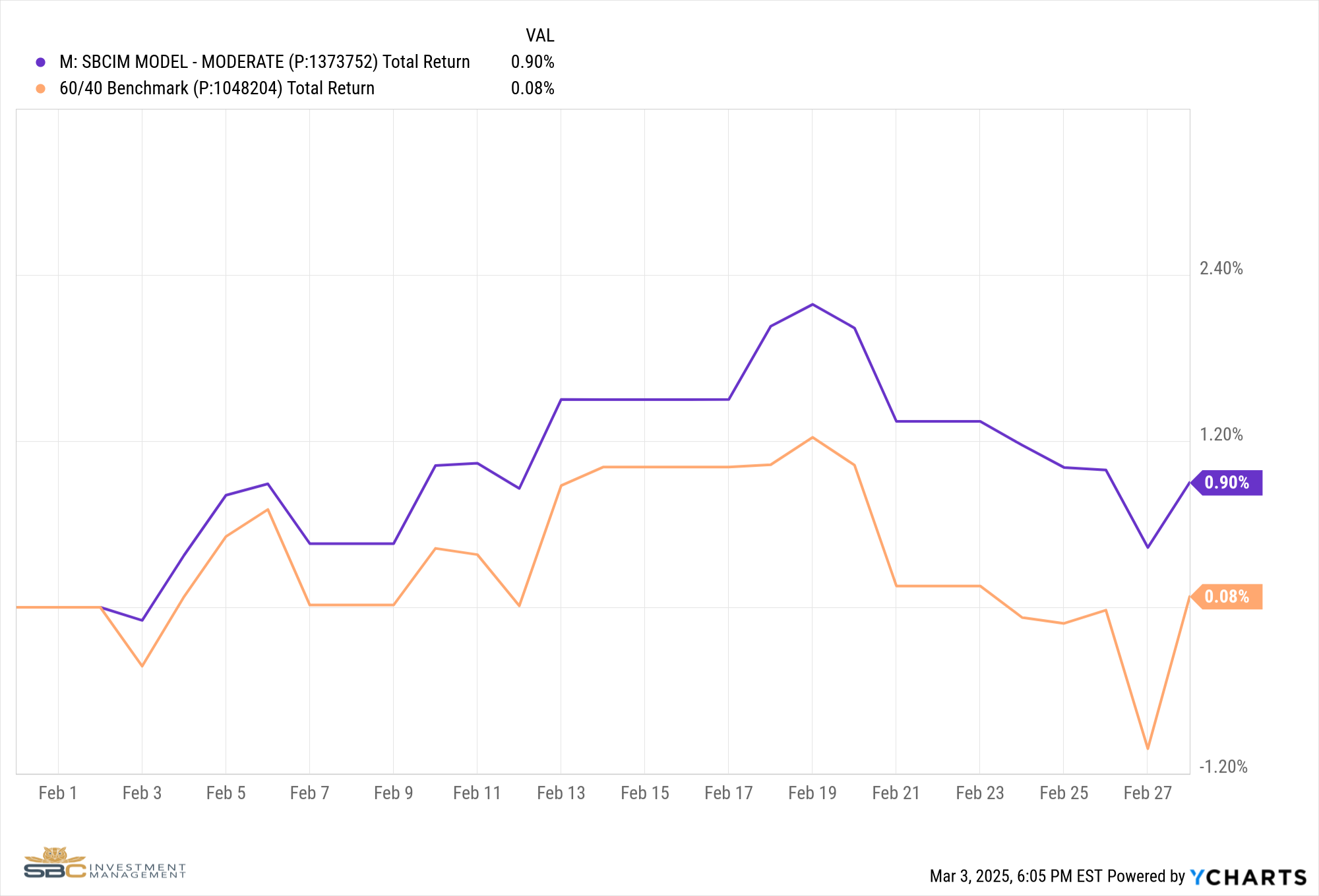For the last few months, we have been writing about our expectations for heightened market volatility in 2025. Last month specifically, we highlighted tariff concerns and wrote about how we planned to scale back risk in specific areas of the markets moving forward. We did so by selling IJT (Small Cap Growth), PSCI (Small Cap Industrials), and UUP (US Dollar) in our portfolios, which returned -5.28%, -6.46%, and -0.41%, respectively in the month of February. We have also been stressing that a globally diversified portfolio is preferred a domestic-focused one as we believe diversifying across various international markets can help mitigate risks associated with any single economy. In February we saw the positive effects that Global Diversification can have on portfolios with the MSCI EAFE index up 1.95%, while the S&P 500 had a negative return of -1.3%. Over the past several years, this global focus has been a bit of a drag on our portfolios when compared to US only markets. However, it is showing up when domestic markets are pulling back.