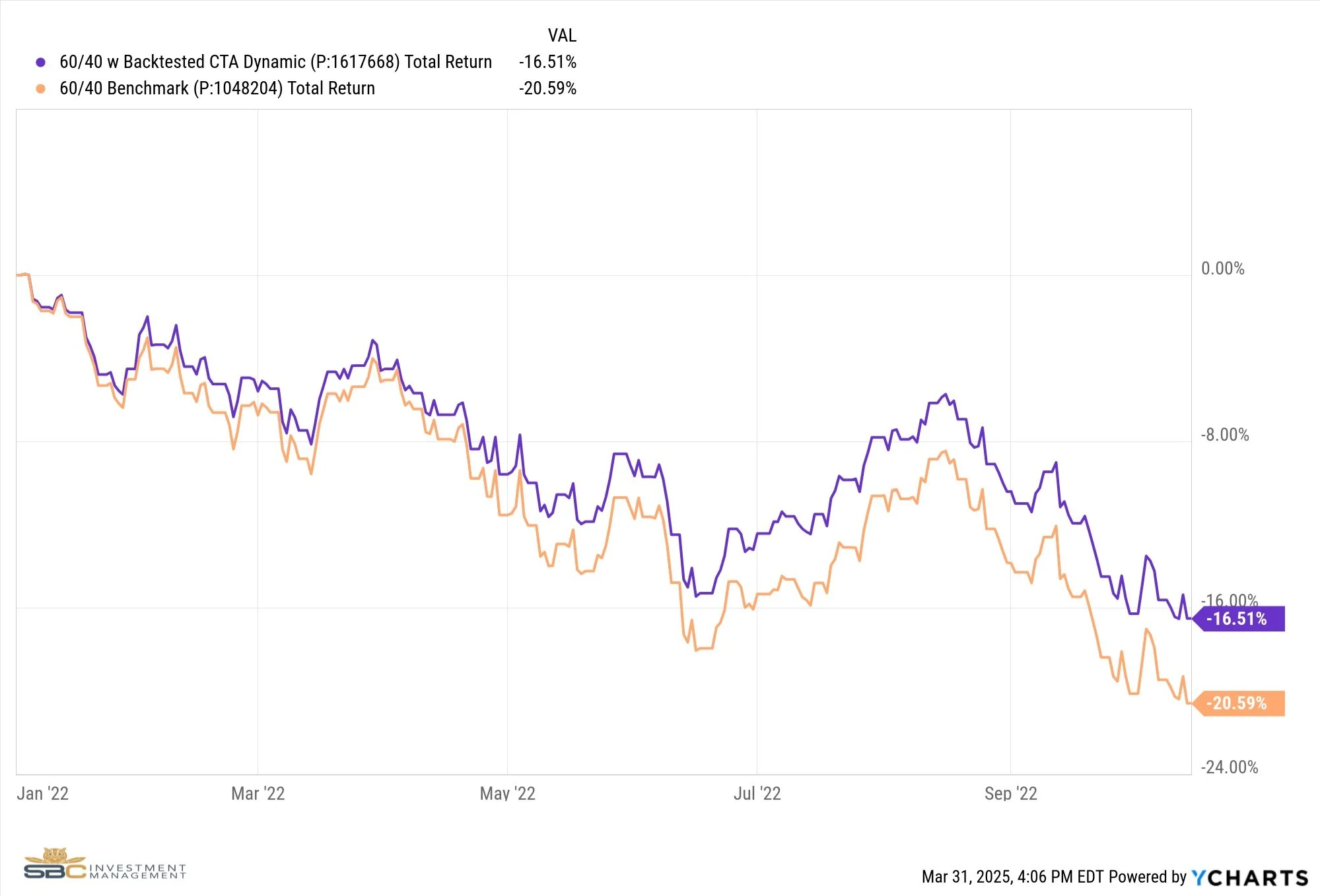 Hypothetical performance results shown in this report and on sbcinvestmentmanagement.com are backtested and do not represent the performance of any account managed by SBC Investment Management, LLC. They were achieved by means of the retroactive application of each of the previously referenced models, certain aspects of which may have been designed with the benefit of hindsight.
