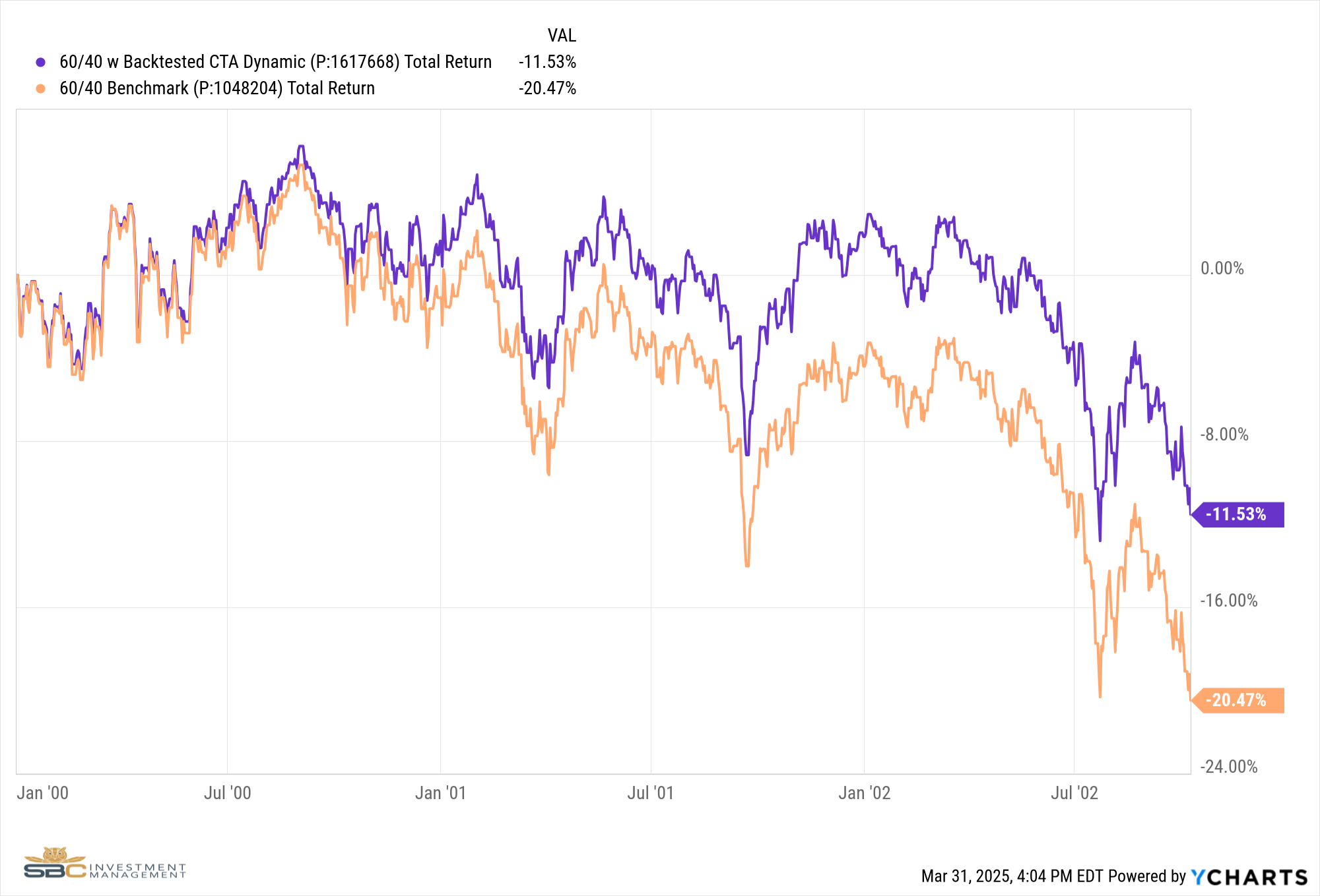 We were fortunate to receive hypothetical back-tested data from the fund managers of CTA, allowing us to demonstrate the benefits of including managed futures in an investment portfolio. The following charts compare a 60/40 Benchmark Portfolio with that same 60/40 Portfolio that includes a 10% allocation to managed futures during previous periods where the financial markets saw significant distress.