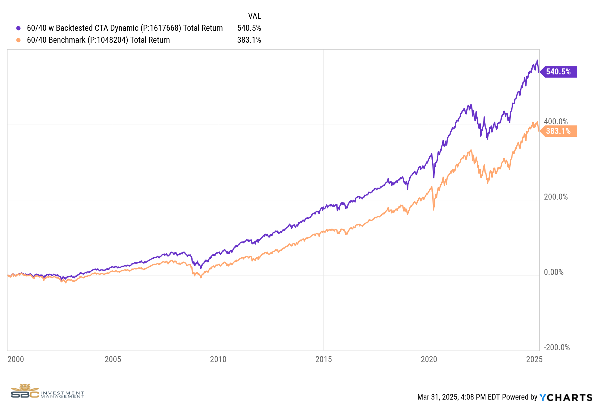 The same 60/40 portfolio that included a 10% position in managed futures would have generated a return of 540.5% going back to the year 2000 compared to the portfolio without managed futures, which returned 383.1% over that same period.
