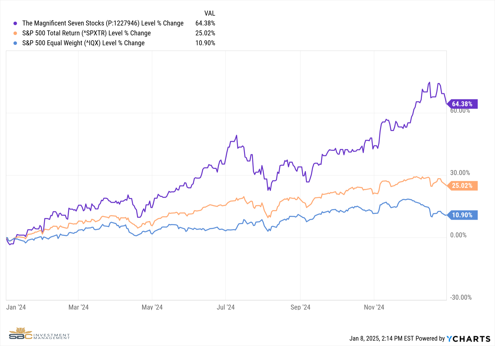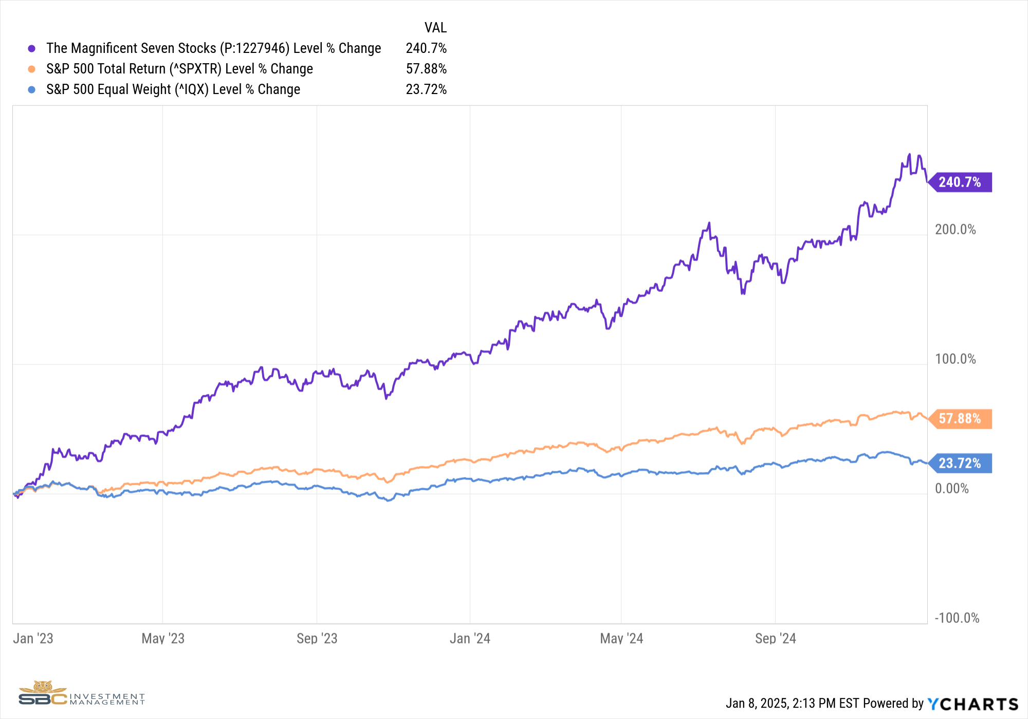 Past performance may not be indicative of future results. Different types of investments involve varying degrees of risk. There can be no assurance that the future performance of any specific investment, investment strategy (including the investments and/or investment strategies recommended or undertaken by SBC Investment Management, LLC), or any non-investment related content, referred to directly or indirectly in this piece will be profitable, equal any corresponding indicated historical performance level(s), or prove successful. Due to various factors, including changing market conditions and/or applicable laws, the content may no longer be reflective of current opinions or positions. Moreover, you should not assume that any discussion or information contained in this piece serves as the receipt of, or as a substitute for, personalized investment advice from SBC Investment Management, LLC. Investment performance results published herein do not include investment advisory fees paid, or any other related account expenses. Performance results compiled solely by SBC Investment Management, LLC, have not been independently verified, and do not reflect the impact of taxes on non-qualified accounts.
