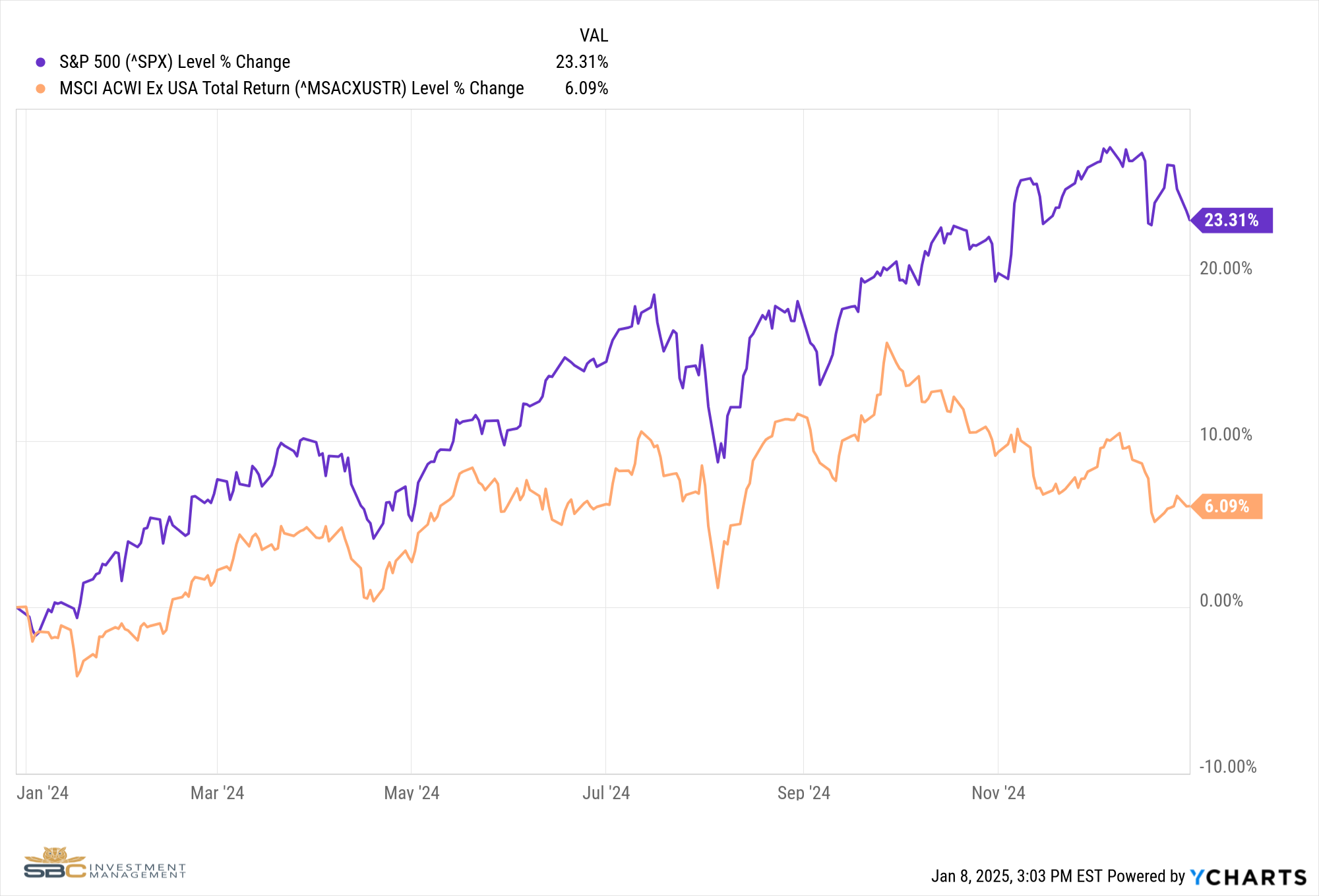 The charts above are just US performance. Many portfolios, ours included, are globally diversified and have allocations outside the US. There are many arguments which we will not get into today that state Global Diversification over long periods of time leads to higher risk-adjusted returns and lowers overall portfolio volatility by holding non-correlated assets. However, in 2024 Global Markets severely underperformed US Markets returning just 6.09%.