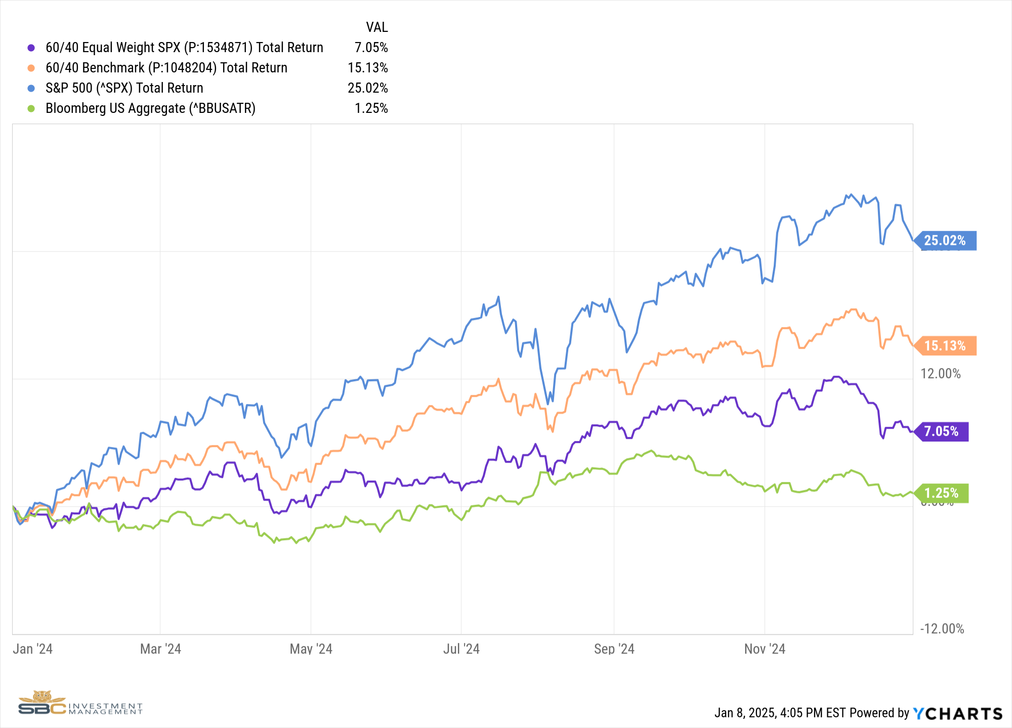 On the topic of diversification, the 60/40 allocation was far behind the S&P 500 in 2024. Bonds struggled as inflation remained higher than expected throughout the year, with the Bloomberg US Aggregate ending the year up just 1.25% on a total return basis.