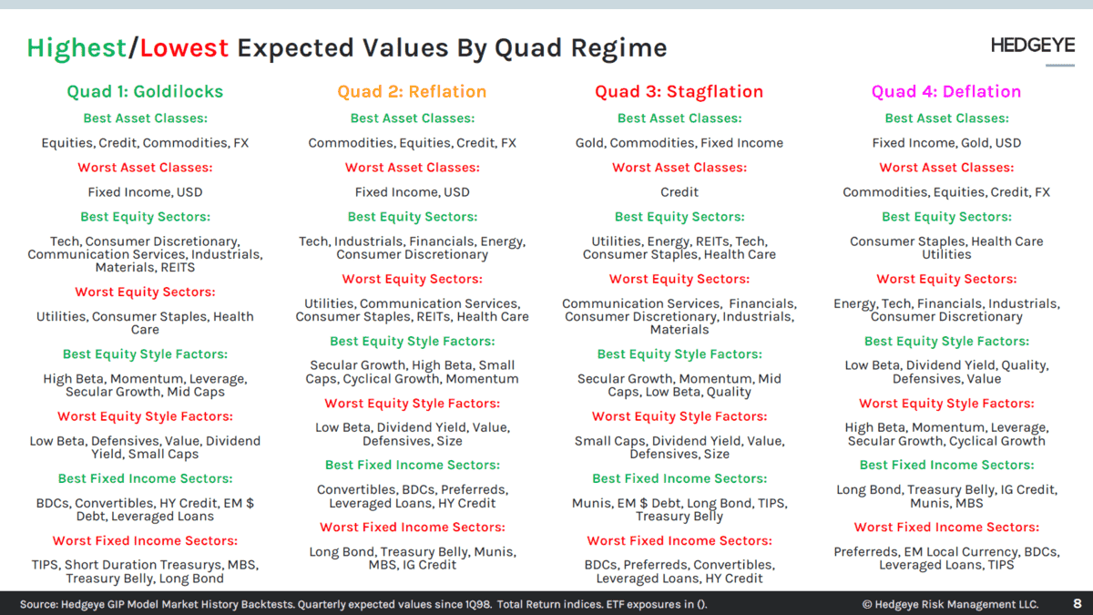 We subscribe to 3rd party research. One of these parties is Hedgeye Risk Management. Without going into too much detail, one of Hedgeye’s models is their GIP (Growth Inflation Policy) model. In this model the two factors that are most consequential for forecasting future financial market returns are Economic Growth and Inflation. The model tracks both on a y/y rate of change basis to better understand if growth and inflation are heating up or cooling down. This results in four possible outcomes, each which is assigned a “quadrant” and the typical government response as a result. This model is back tested with the chart below showing the different quads and what typically works well or doesn’t work well in each, ranked in order. This helps us use a top-down approach as our principal orientation to get into the bottom up.
